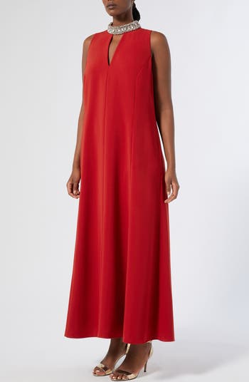 A bejeweled neckline instantly accessorizes a siren-shaded dress cut in a swingy silhouette.