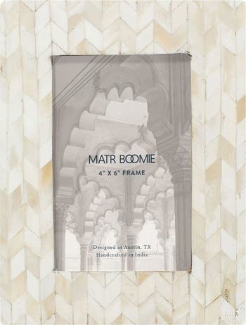 Display your most treasured memories in this handcrafted photo frame, featuring cruelty-free, ethically sourced bone tile in an inlaid chevron mosaic design. The picture frame is easily accessed with metal swivel tabs and removable back. Sizes include: 3x3, 4x6, 5x7, 8x10, 4x6 double, 5x7 double