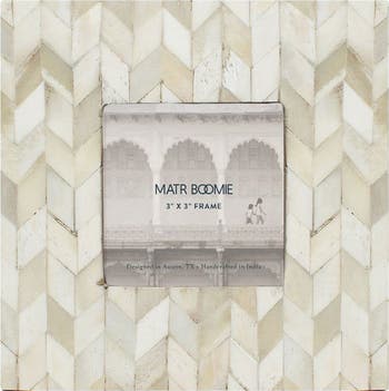 Display your most treasured memories in this handcrafted photo frame, featuring cruelty-free, ethically sourced bone tile in an inlaid chevron mosaic design. The picture frame is easily accessed with metal swivel tabs and removable back. Sizes include: 3x3, 4x6, 5x7, 8x10, 4x6 double, 5x7 double