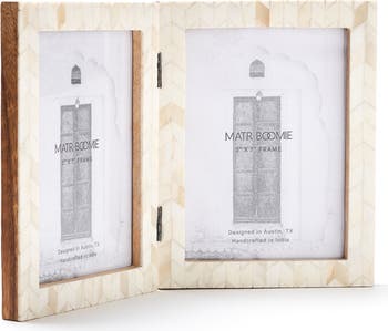 Display your most treasured memories in this handcrafted photo frame, featuring cruelty-free, ethically sourced bone tile in an inlaid chevron mosaic design. The picture frame is easily accessed with metal swivel tabs and removable back. Sizes include: 3x3, 4x6, 5x7, 8x10, 4x6 double, 5x7 double