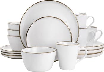 Add a beautiful accent to your dining table with the Elama Arthur 16 Piece Round Stoneware Dinnerware Set in sophisticated Matte White with Gold Rim Trim. Each dish is creatively crafted with a unique flat base, raised rim and trimmed in gold. Beautifully finished off with an thin, elegant gold rim this set is a statement piece. Constructed of Stoneware, this set is ideal for special occasion gatherings and sturdy for every day use. Each plate is microwave safe for quick reheating and dishwasher safe for easy cleaning.