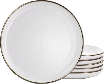 Add a beautiful accent to your dining table with the Elama Arthur 6 Piece Round Stoneware Dinner plate Set in sophisticated Matte White with Gold Rim Trim. Each piece is creatively crafted with a unique flat base, raised rim and trimmed in gold. Beautifully finished off with an thin elegant gold rim, this set is a statement piece. Constructed of Stoneware, these dinner plates are ideal for special occasion gatherings and sturdy for every day use. Each plate is microwave safe for quick reheating and dishwasher safe for easy cleaning. Mix an match with new pieces and pieces you've collected over the years.