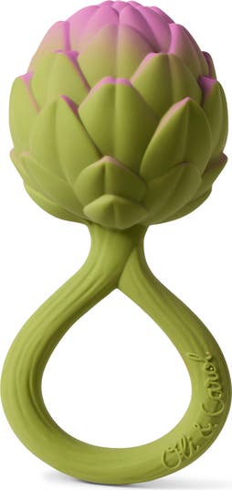 This handcrafted rattle is made from natural Hevea-tree rubber with hand-painted details and no holes (so no mold can grow inside.)