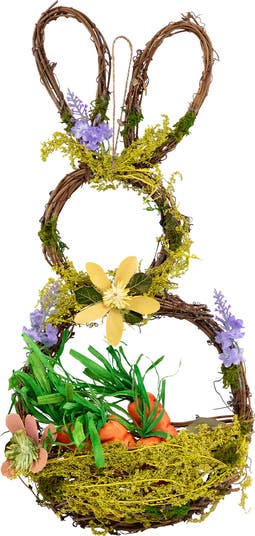 This bunny-shaped Easter basket decoration is crafted from natural grapevine, creating a rustic and textured look. Decorated with lilies, greenery, and soft moss, it captures the essence of spring. Inside the basket, vibrant carrots and handcrafted wood shaving flowers add a unique touch. A jute rope is included for easy hanging, while the piece can also be leaned for display on tabletops or shelves, making it a versatile addition to any space. Product Features: Bunny shaped grapevine design Attached jute rope for hanging Recommended for indoor use only Dimensions: 14.5"H x 8"W x 7"D Material(s): wood/plastic/fabric