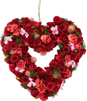 Our romantic 13.5” heart wreath features wooden roses in red, the color of love, accented with touches of pink. Small sprigs of artificial greenery tucked between delicate silk, and preserved and wood flowers add a vibrance and freshness to this pink and red heart-shaped wreath. Brighten your home with this winter wreath as a Valentine’s Day decoration and a part of your home decor style throughout the season with this captivating expression of constancy and devotion. Product Features: Ready to hang on a jute cord Flat foam backing No assembly required - wreath comes in 1 piece Recommended for indoor use - if using outdoors place under a covered area Dimensions: 13.5"H x 12"W x 2"D (measured from outermost edge to outermost edge across the wreath) Material(s): wood/fabric/foam/jute