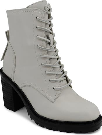 Bring some attitude to your next ensemble with this combat boot that's given a chic lift with a platform and block heel for sky-high, but steady style. Elongated fold-over tabs on the back add interest and the raw leather laces lend textural edge.