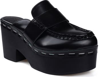 Tonal stitching and a loafer-inspired topline lend luxe elements to a leather mule lifted by a chunky platform and soaring block heel.