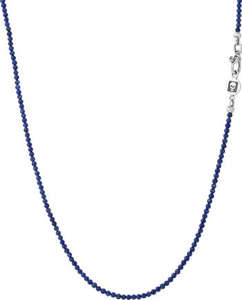 Polished lapis lazuli stones compose a beaded necklace secured by a weathered sterling silver lobster clasp with signature skull hardware.