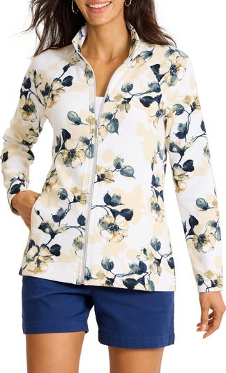 Watercolor blooms charm this soft cotton-blend sweatshirt made with a sporty front zip for easy layering.