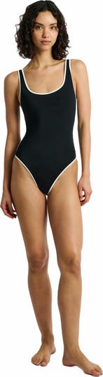 Made of smoothing tricot fabric, our Arya one-piece is a classic tank suit that turns to reveal a circular cutout in the back as well as an adjustable hook closure. Its scooped neckline, straps, and high-cut leg are all traced in contrast binding.