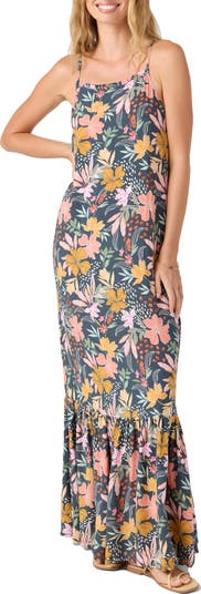 Colorful flowers brighten an flowy maxi dress that drapes the body with ease and is styled with a tiered hem.