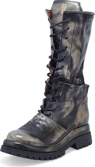 Strategically distressed leather enhances the rugged style of this mid-calf lace-up boot grounded by a platform lug sole.