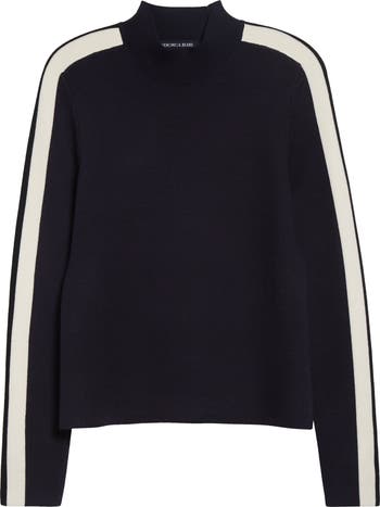 Streamlined with a neat mock neck, this fine-gauge sweater pulls bold racing stripes from the shoulders to the cuffs in sharp contrast.