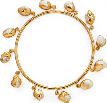 The Asara Bangle is handcrafted in 22k gold-plated brass and accented with gold dipped baroque pearls. Its smooth, open form slips easily onto the wrist and moves naturally with you, making it a wearable statement for both day and evening looks.