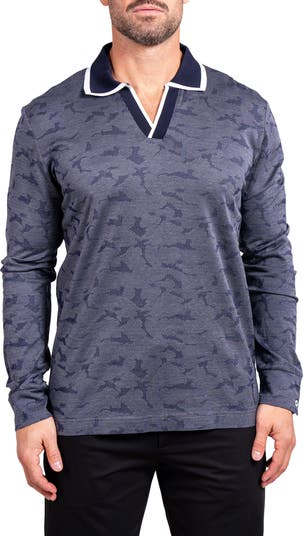 Maceoo Ascension0004 Blue Johnny Collar Long Sleeve Cotton Jacquard Polo, Alternate, color, Blue