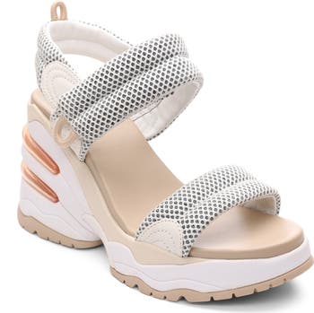 Channel sport-glam perfection in a chunky wedge sandal furnished with cushy mesh straps and bubbly heel insets completing the futuristic silhouette.
