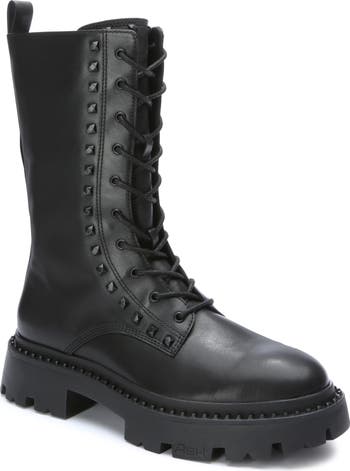 A lug platform sole heightens the utilitarian style of a bold combat boot crafted from luxe leather and embellished with tonal studs for a modern touch.