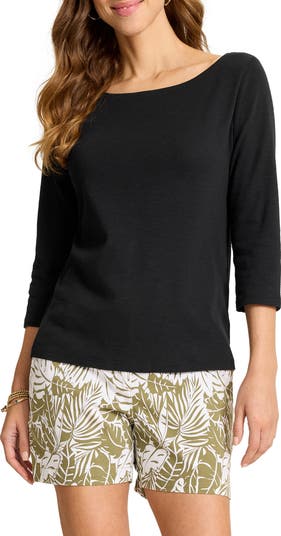 Love to layer in this comfy slub-cotton top made with a wide neckline and framed by three-quarter sleeves.
