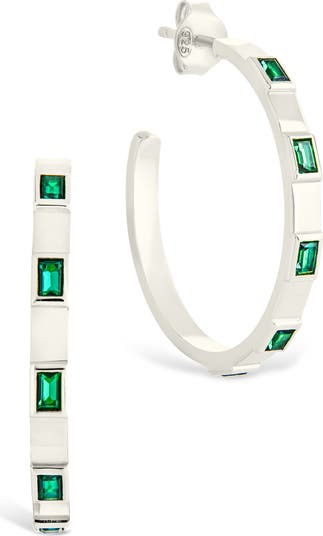 Verdant-hued cubic zirconia lend rich color and shine to slender hoop earrings done in a high-shine finish to exude sophisticated luxury.