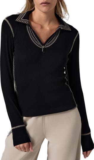 Stretchy ribbing gives this embroidery-decorated polo its fit that skims the figure without feeling too snug.