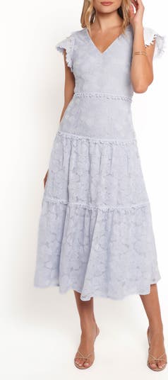 Tonal floral embroidery ups the charm factor of this airy, tiered midi dress that's perfect for daytime weddings, fancy brunches and everything in between.