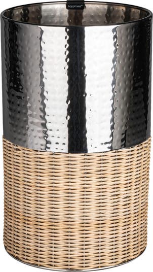 Our modern, two-tone wicker trash can combines sleek metal and woven texture for a mid-century look. This slim wastebasket fits easily into a small bathroom, bedroom or office. Stylish for indoors, it's made from steel and synthetic wicker woven onto a steel frame.