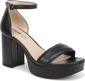 A lofty block heel elevates this sleek ankle-strap sandal balanced by a chunky platform sole for confident night-out height.