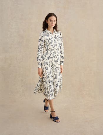 A flowing shirt dress, sculpted waist and soft pleats create graceful movement from office hours to evening plans.