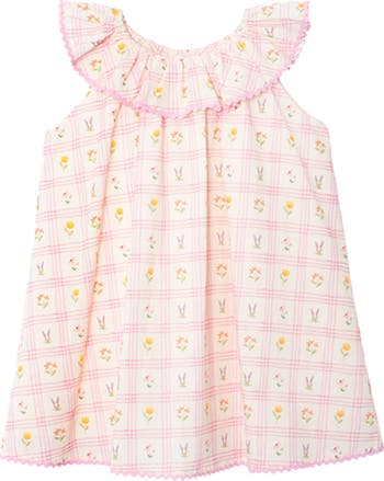 This sleeveless dress features a light beige checkered pattern with pastel flower motifs, a ruffled collar, and pink scalloped trim. Crafted from soft, breathable fabric, it offers a playful yet delicate design.