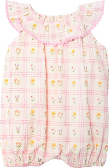 This cotton woven baby romper features a ruffled collared neckline with a ric rac trim. Fabric Care & Content Machine Wash Cold | Line Dry | Do Not Bleach 100% Cotton Denier lining