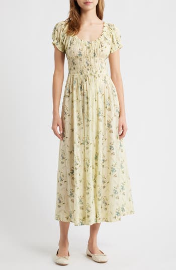 The cult-favorite Cali brand's retro/romantic aesthetic pervades every stitch of this airy organic-cotton voile midi dress sweetened with intricate shirring, dainty ruffles and dual bows.