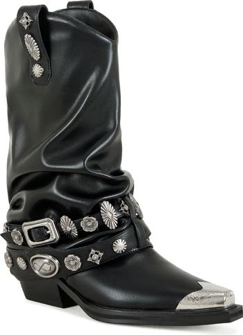 Polished studs highlight the buckle straps of this updated Western boot complete with a metallic snip toe.