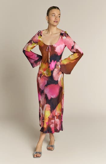 Meet Ashton, the dress made for late nights and stolen dance floors. Cut on the bias in a fabric that skims the body, this midi party dress is splashed in a bold abstract floral print that does all the talking. The round neckline and long, flared sleeves bring just the right amount of drama, while the effortless silhouette keeps it cool and wearable, perfect as a wedding guest dress.
