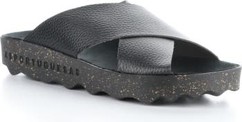 Pebbled straps crisscross over this sport-casual slide sandal set on a contoured footbed and lightweight cork-blend sole.