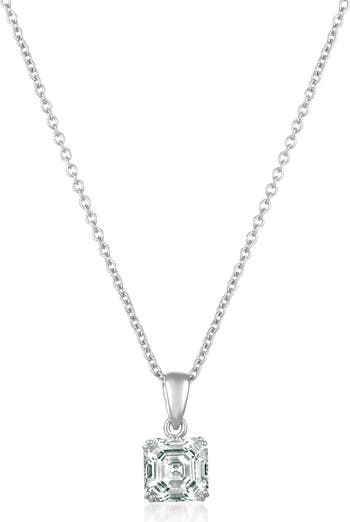 A stunning Asscher-cut cubic zirconia twinkles at the heart of this minimalist pendant necklace plated in polished platinum.