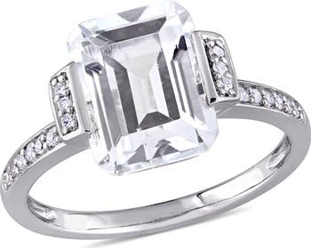 This striking ring is crafted in sterling silver and features a large asscher cut white topaz enhanced by a diamond studded shank. This lovely ring is the perfect choice for your bride-to-be as you celebrate this special time in your lives.