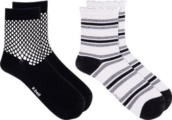 These assorted crew socks feature one pair with net insets at the cuffs and a coordinating pair with lace-trimmed cuffs.