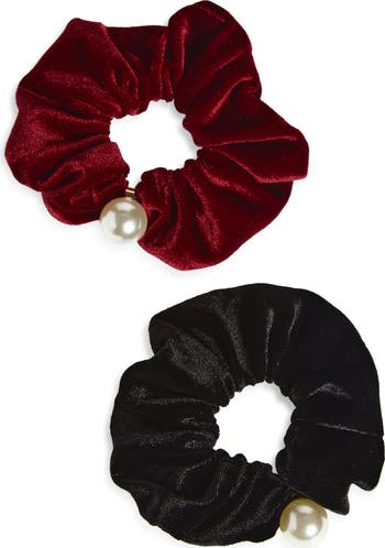 Transform your tresses into a soirée-worthy statement with this duo of plush velvet scrunchies—each adorned in a lustrous faux pearl.