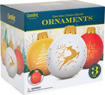 Celebrate the season in a BIG way with this trio of jumbo ornaments made from durable, heavy-duty vinyl. Each package includes a high-efficiency air pump that inflates ornaments in minutes, so you can deck the halls without delay.
