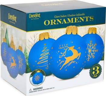 Celebrate the season in a BIG way with this trio of jumbo ornaments made from durable, heavy-duty vinyl. Each package includes a high-efficiency air pump that inflates ornaments in minutes, so you can deck the halls without delay.
