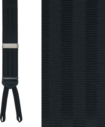 Take your wardrobe to the next level with the Astaire formal end braces. They feature a stripe inlay design with the option of black on black or black on gray which both give an air of sophistication. Wear them to your next special event with a suit or tuxedo. Handcrafted in the United States, they have front formal ends and back formal ends that attach to the waistband with buttons (a set of six buttons is included). The silver adjusters are adjustable up to 54 inches and slide to the ideal fit. Put the finishing touch on your look with this handsome accessory.