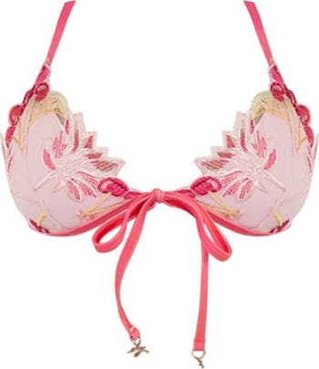 Aster features intricate cherry lace paired with vibrant hot pink straps for a striking contrast.