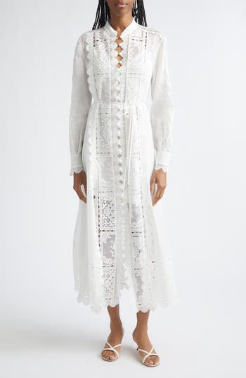 Panels of airy eyelet and embroidery in front are flanked by scalloped lace trim, while filmy lace insets travel down the sleeves on this breezy midi dress that's a handcrafted work of art. Crochet-covered buttons fastened with loops extend the full length of the dress, and miniscule picot trim edges the band collar, displaying the label's penchant for meticulous detail.