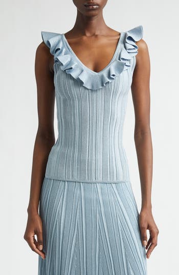 The metallic threads woven throughout the dimensional ribbing evoke a sun-soaked escape in this fitted sweater-tank framed with a frilled V-neck for playful flounce.