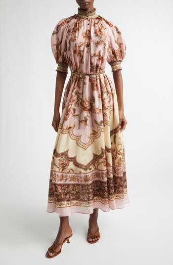 Ornate blooms and spiky borders bring opulence to this silk maxi dress from Zimmermann's swim '26 collection. Framed with poufy sleeves and smocked trim, this airy style is fastened with beaded buttons and cinched with a slim suede-threaded chain tie at the waist.
