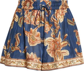 From the summer swim '26 collection, these flowy habutai silk shorts in a Persian floral border print are cut with wide legs in a relaxed fit. They're cinched at the elastic waist with long cords dangling bead-tipped wooden spheres, displaying the meticulous attention to detail the label is known for.