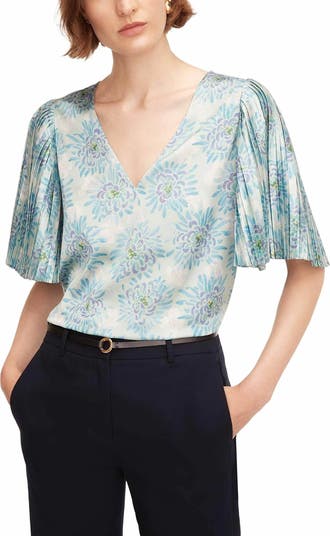 - Swingy, pleated sleeves bring movement to an elegant V-neck top.
