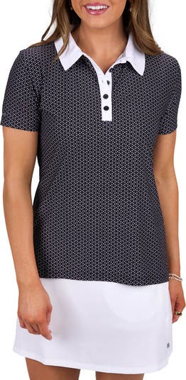 Our women's Asteria Polo combines timeless elegance with modern performance. Featuring a white design with a subtle black pattern, black collar and 5-button placket, it’s crafted from poly spandex performance mesh stretch. Super soft, breathable, and with 4-way stretch, it offers style and mobility.