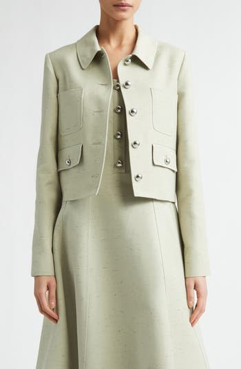 Faint flecks texture this cropped cotton-blend jacket cut in a boxy silhouette and detailed with metal dome buttons inspired by vintage jewelry.