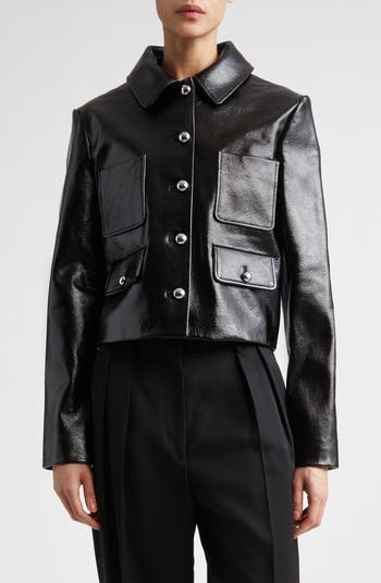 Domed buttons gleam down the placket of this short and chic jacket crafted from textural lambskin leather with a patent-like sheen.